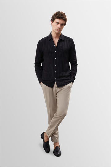 Black dominating with its unique stance the Antioch Long arm Shirt stands out with its luxurious design reflecting a characteristic silhouette. The design of Long arm is complemented with Button closure. The design ensures you feel extremely comfortable with its luxurious texture and fit adapting to your daily city styles and office combinations. Depending on your preference the design can be used with various pants allowing you to achieve a stylish and assertive look taking your style one step further.