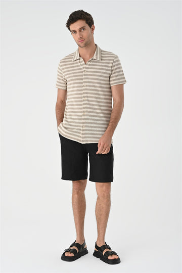 Beige dominating with its unique stance the Antioch Short arm Shirt stands out with its luxurious design reflecting a characteristic silhouette. The design of Short arm is complemented with Button closure. The design ensures you feel extremely comfortable with its luxurious texture and fit adapting to your daily city styles and office combinations. Depending on your preference the design can be used with various pants allowing you to achieve a stylish and assertive look taking your style one step further.