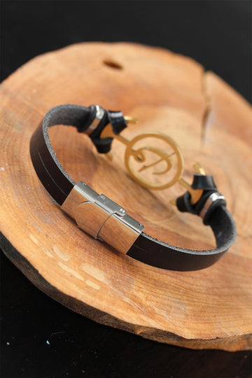 Reflect your difference with the Gold Color Elif Vav Metal Accessorized Black Leather Men's Bracelet.