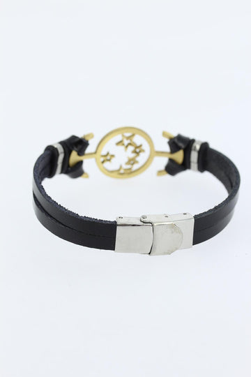 Capture the star combination of the day with the Black Color Leather Men's Bracelet with Gold Color Star Figured Metal Accessory.