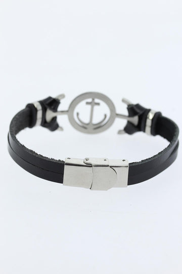 Specially designed Black Leather Men's Bracelet model with Silver Color Sea Anchor Figured Metal Accessory for gentlemen who trust their style.