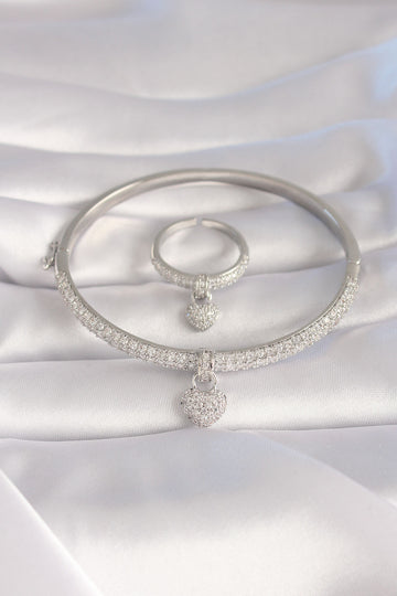EBJ Rice Gold Color Zircon Stone Pendant Heart Figure VIP Series Cuff Ring Set - Uman