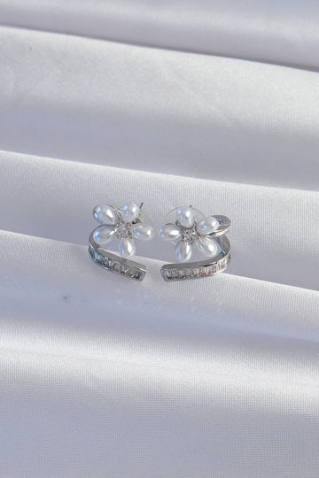 EBJ Rice Silver Color Zircon Stone Curved Pearl Flower Earring - Wedel