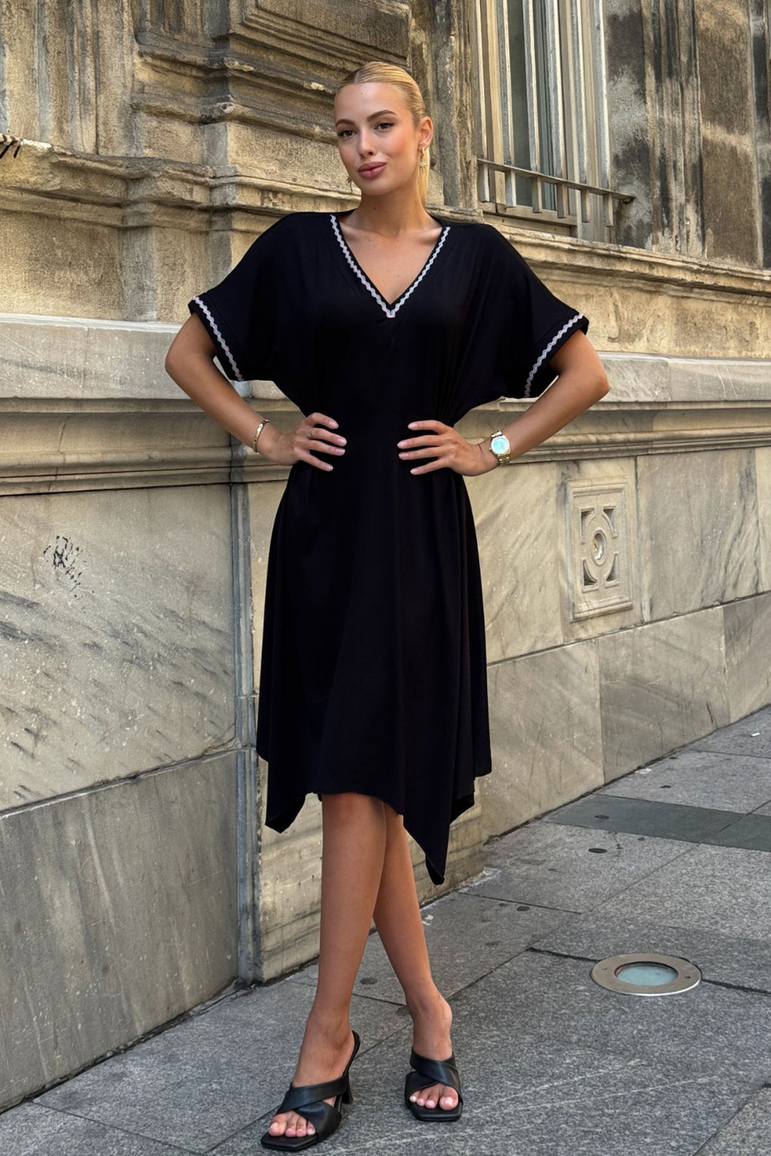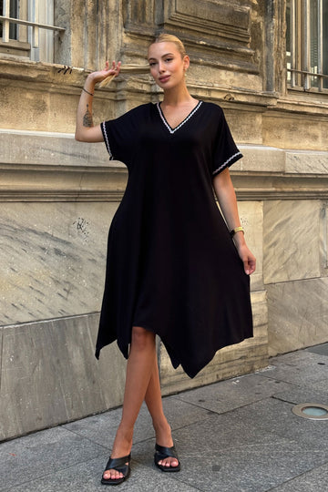 Black Asymmetric Cut V Neck Striped Comfortable Cut Viscon Dress BCVL-25V082 - Flower Mound