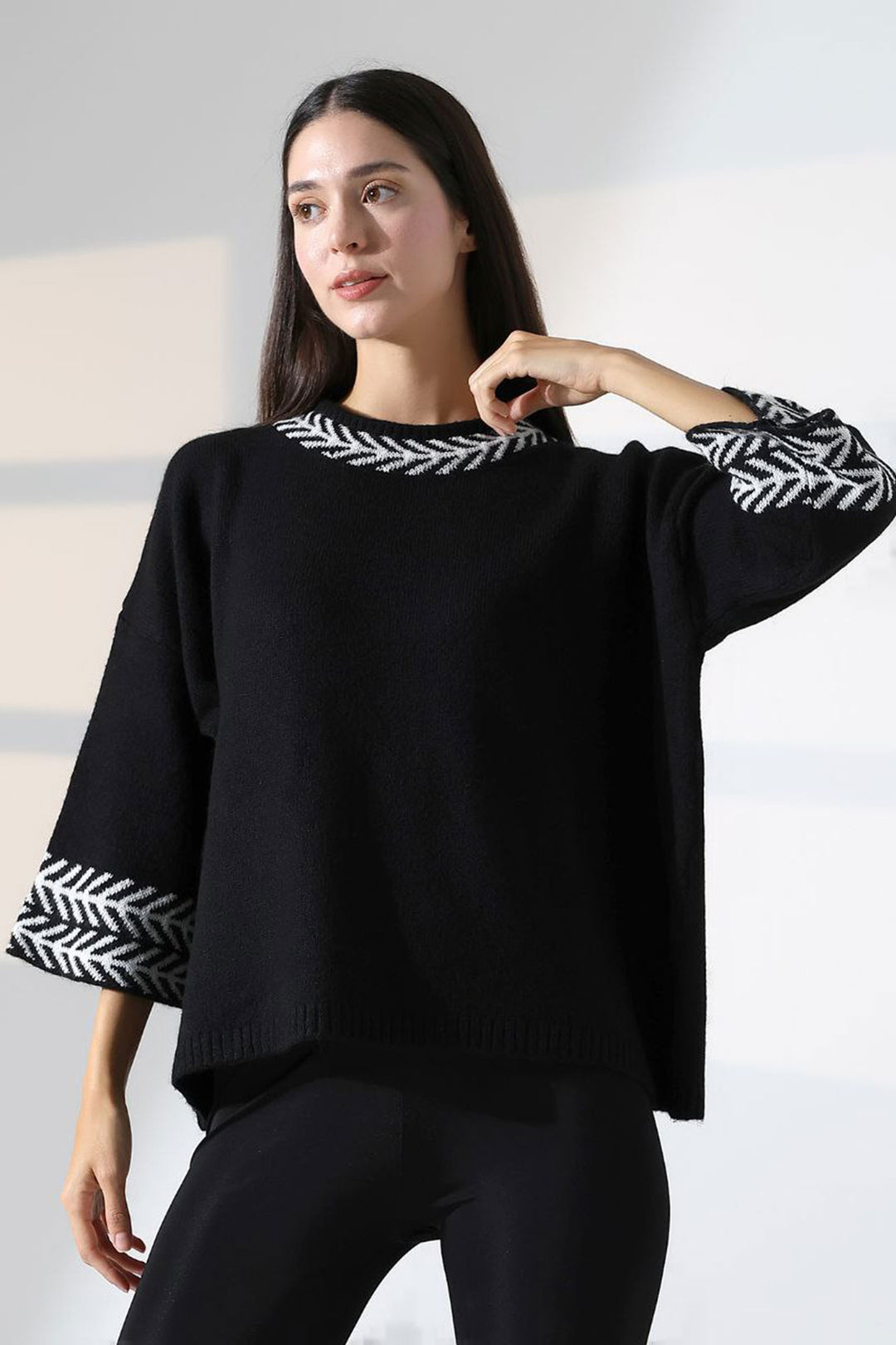 Black Bicycle Collar Patterned Sweater BCES-252038 - Thérmi