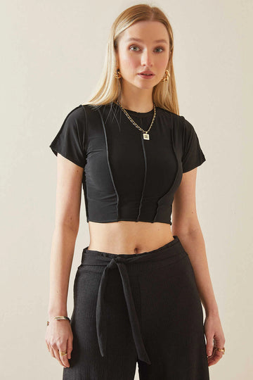 Black Bicycle Collar Stitch Detailed Lycra Crop Blouse BC241129 - Palaió Fáliro