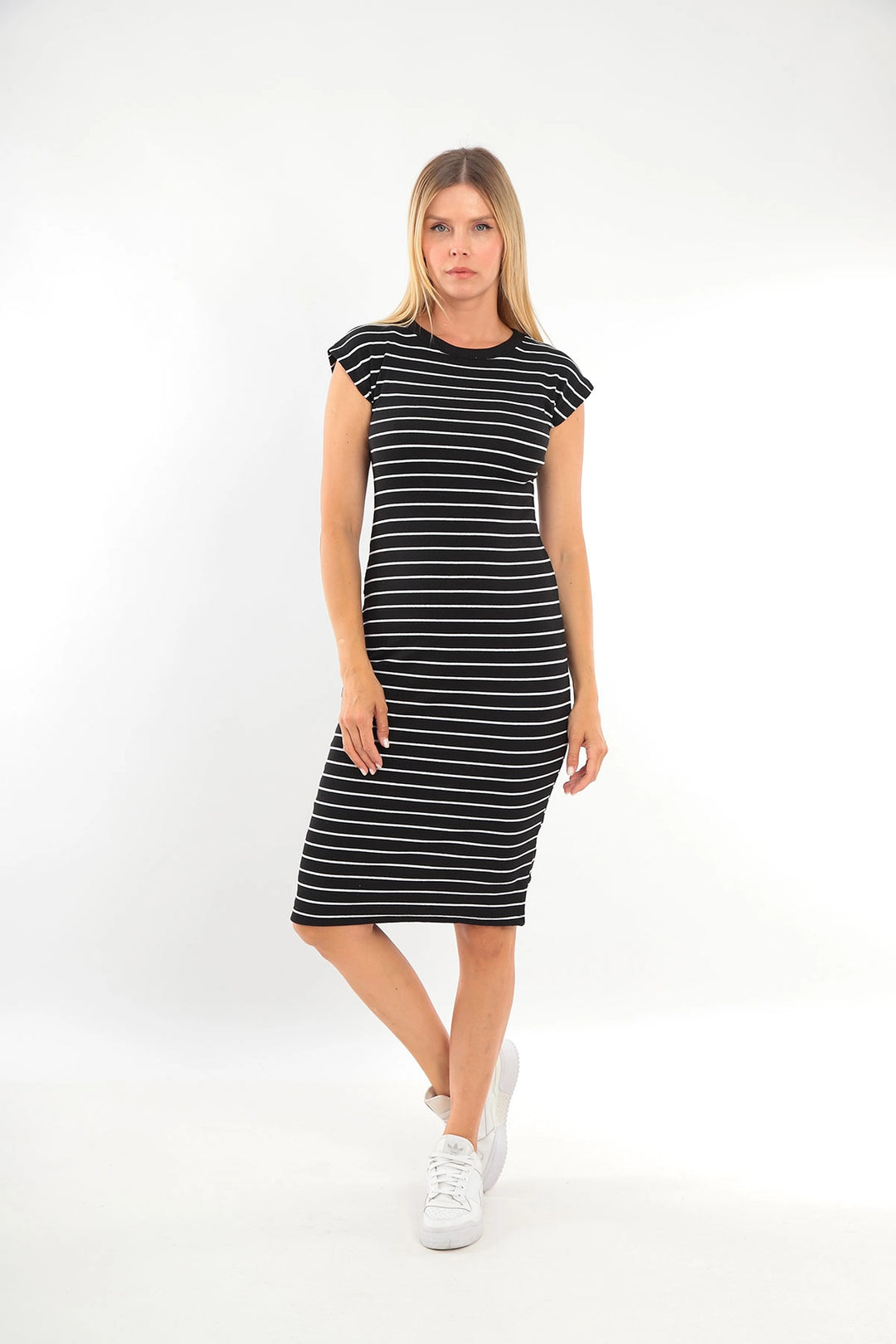 Black Bicycle Neck Ribbed Striped Comfortable Fit Viscon Dress BCVL-2530002 - Villa Victoria