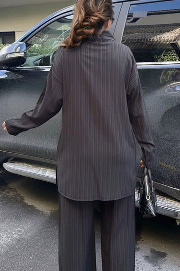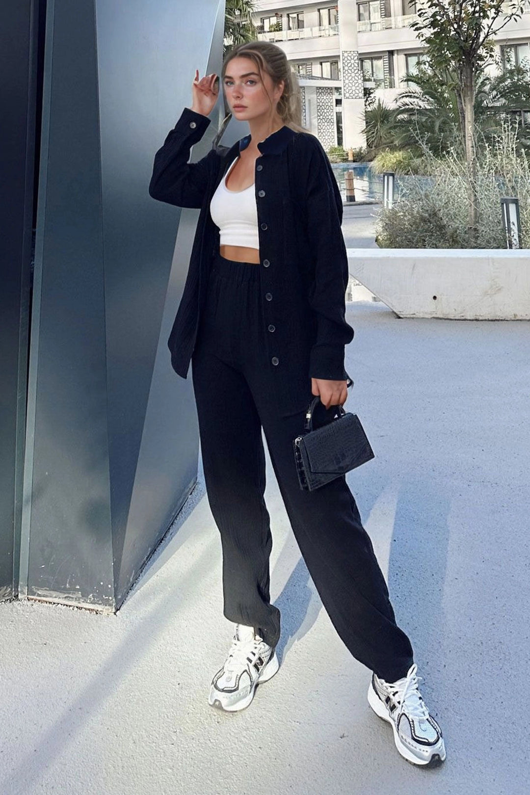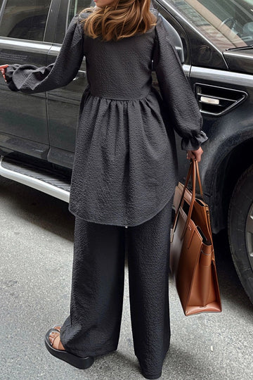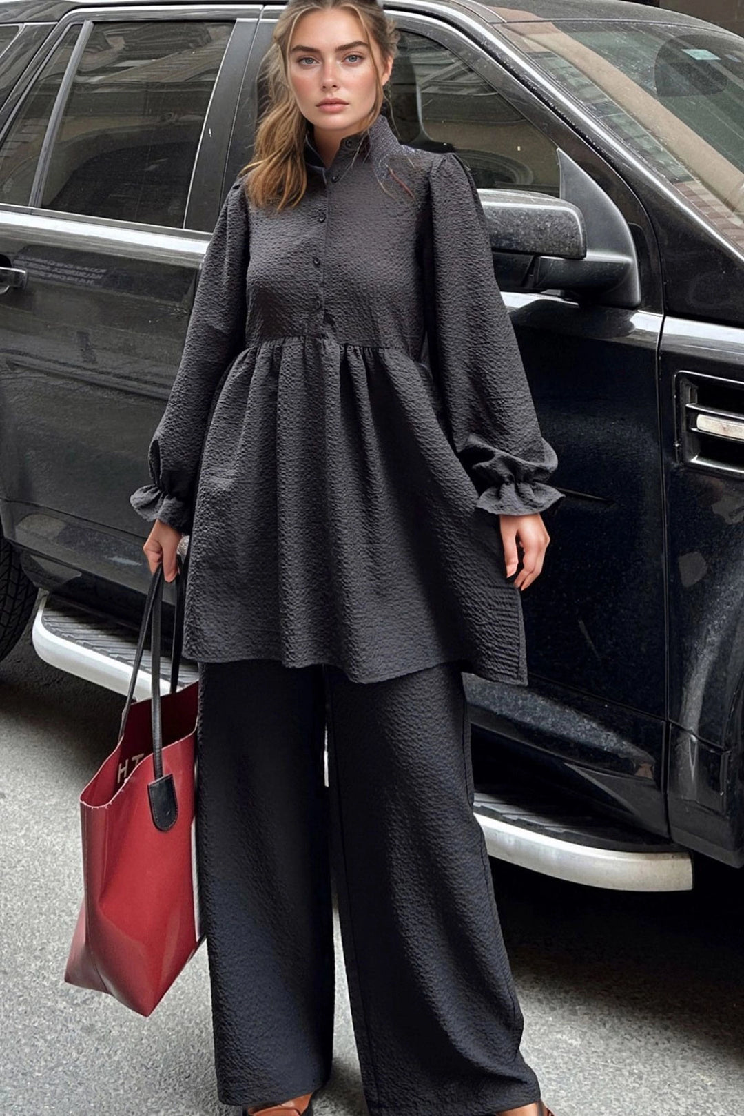 Black Collar Tied Pleated Two Piece Set BCDF-249001 - Tezoyuca