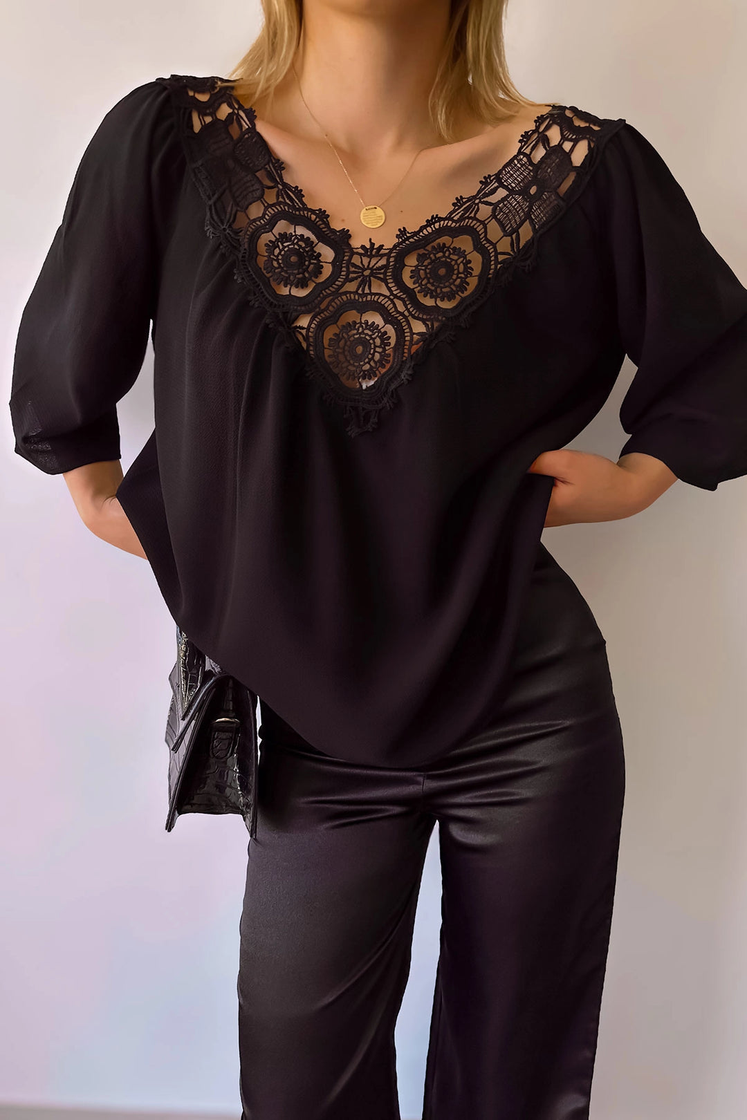 Black Collar Flower Embroidered Blouse BCBSK-25700-T4008410 - Marbella