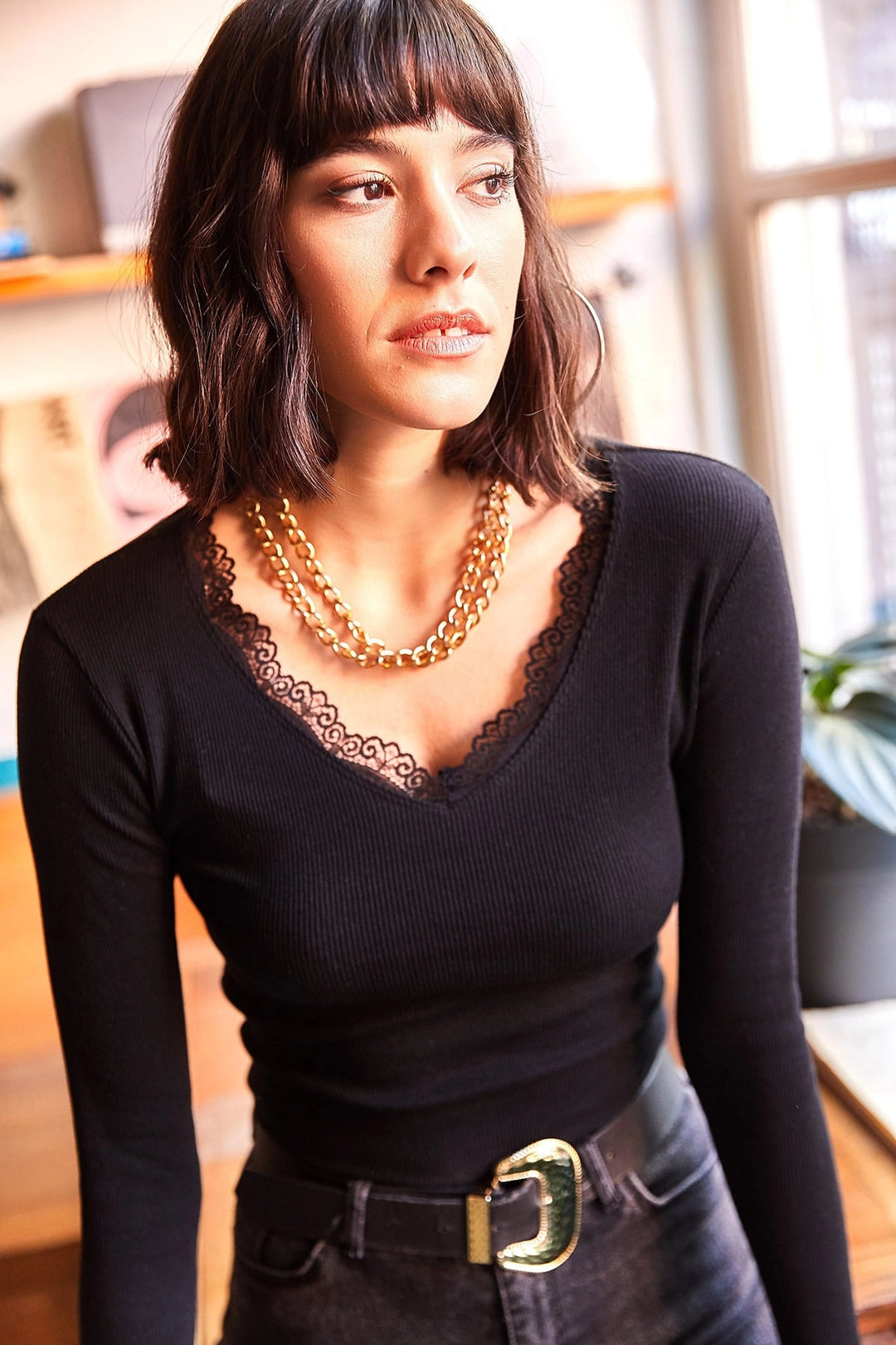 Black Collar Detailed Turtleneck Long Sleeve Blouse BCBSK-25700-K7496 - Uster