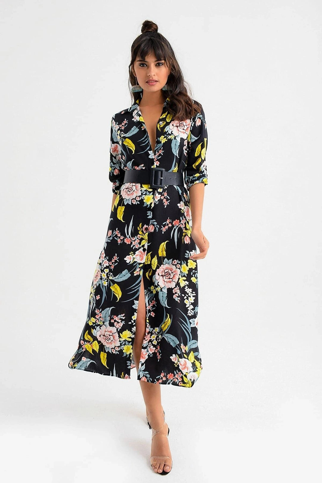 Black Flower Patterned Shirt Dress BCBSK-25700-K4037 - Mâcon