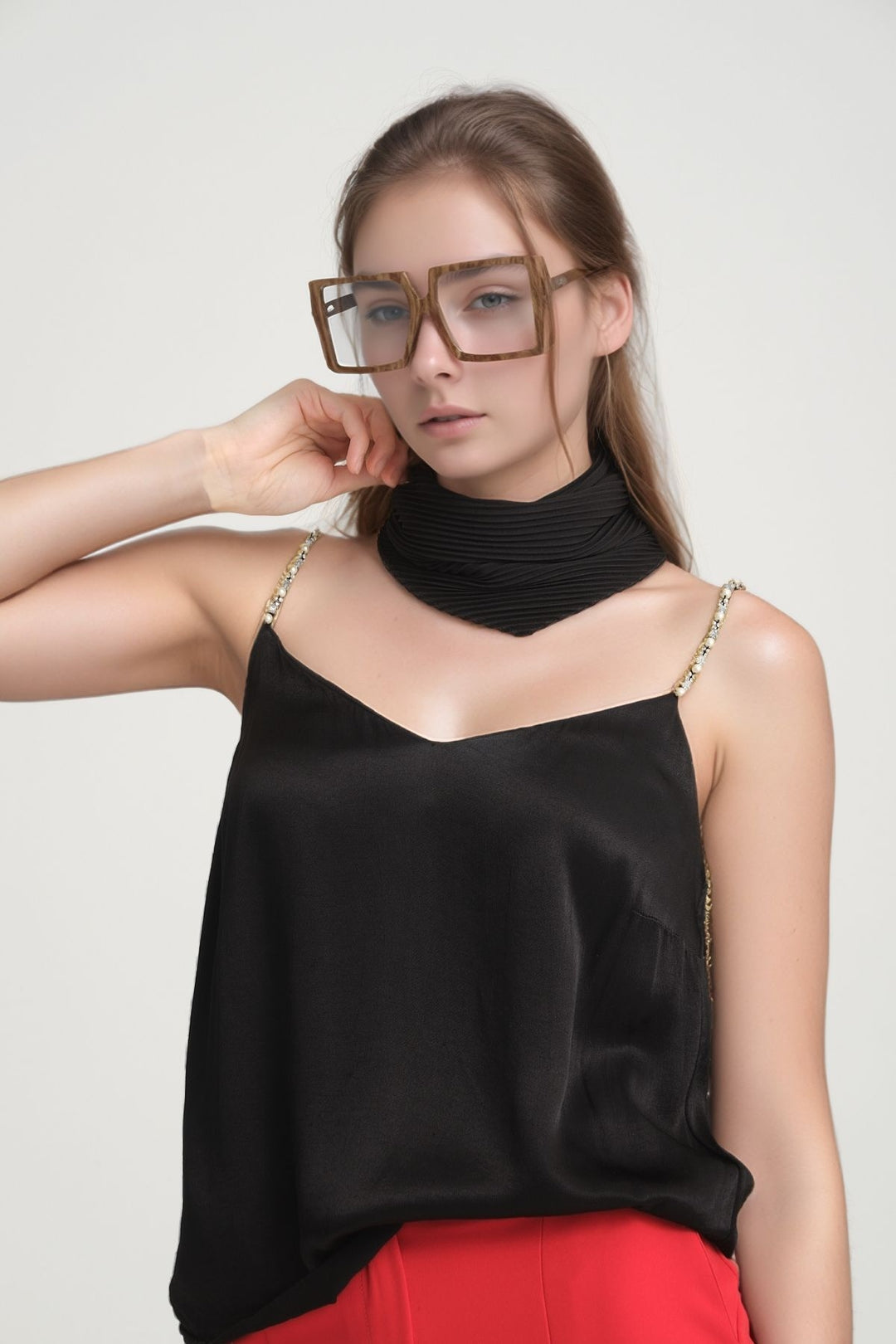 Black Frilled Sleeveless Shirt with Self Patterned Striped Arm BCBSK-25700-3626 - Agrínio