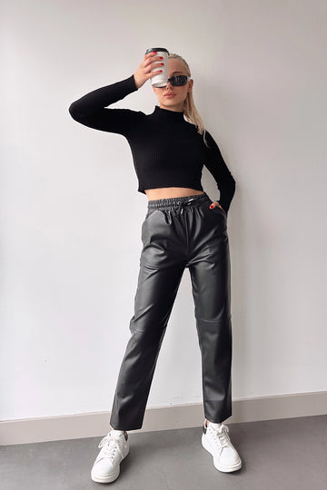 Black High Waist Elastic Comfortable Fit Patched Faux Leather Jogger Pants BC231025 - Évreux