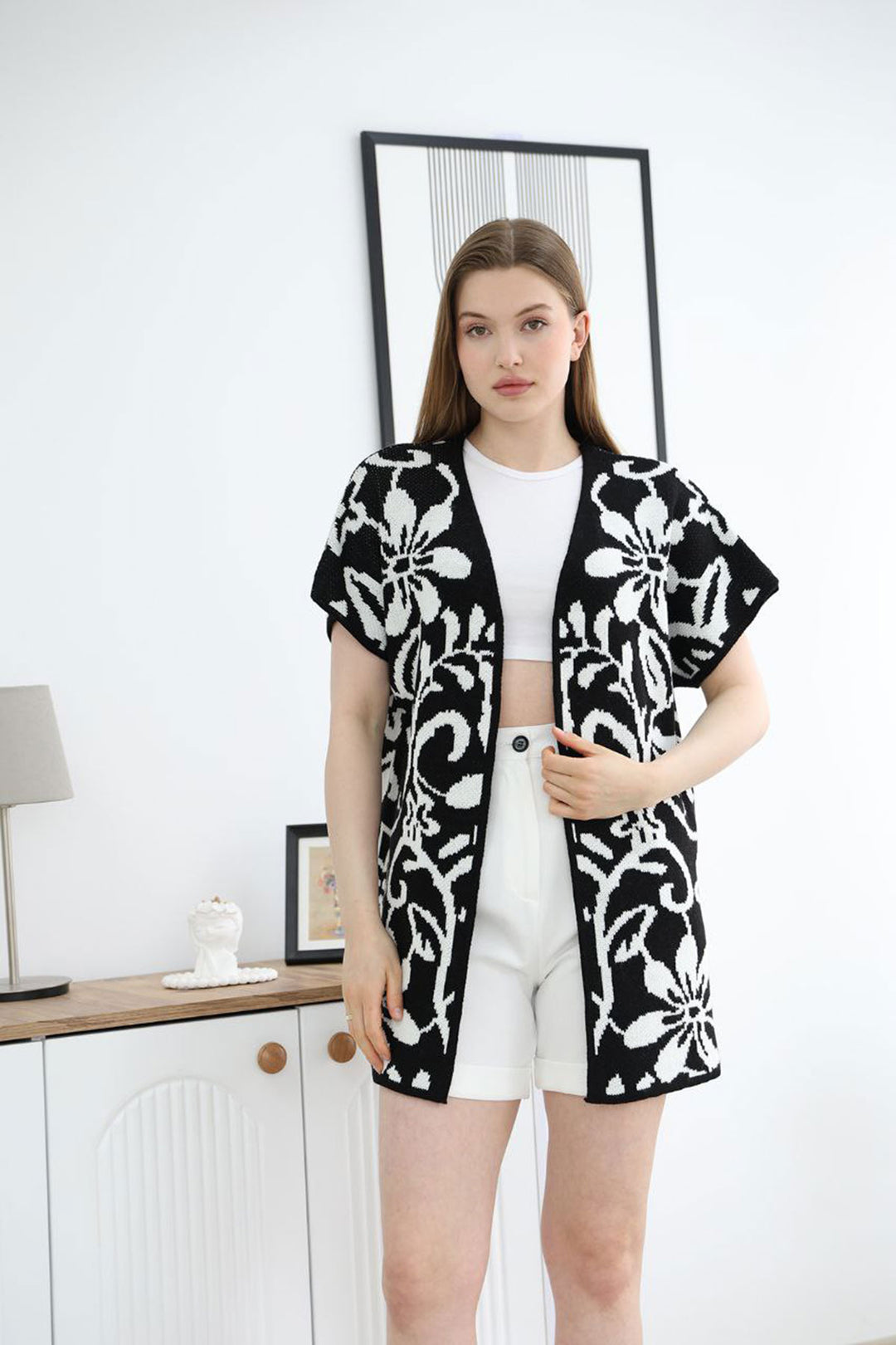 Black Half Sleeve Patterned Knit Cardigan BCES-252007 - Voznesensk