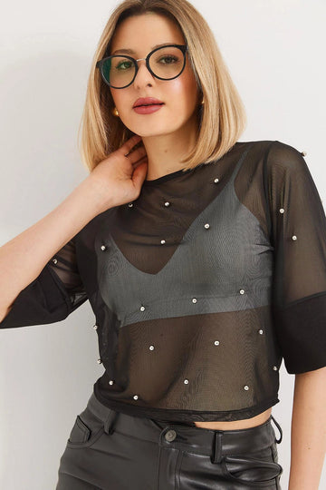 Black Half Sleeve Pearl Transparent Blouse BCCL-253003 - Almada