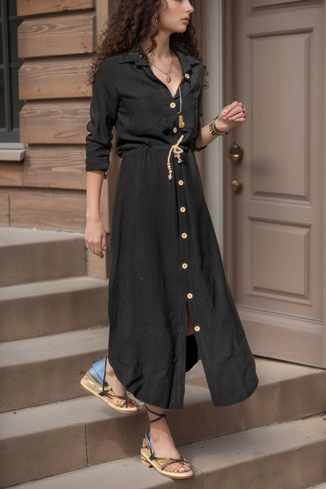 Black Linen Collar Slit Pocket A-Line Loose Dress BCBSK-25700-3428 - Redcar