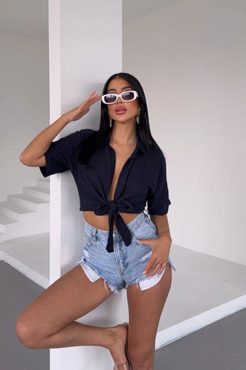 Black Muslin Fabric Linen Woven Shorts with Wrap Tie BCBT-251002 - Brownsville