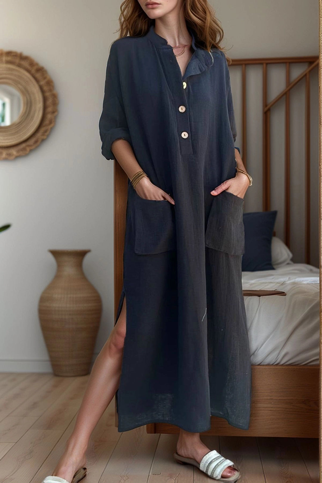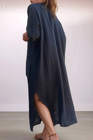 Black Muslin Half Placket Pocket Slit Loose Fit Baggy Dress BCBSK-25700-3620 - Elyria