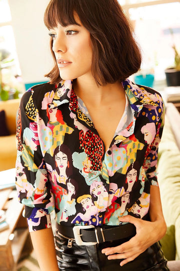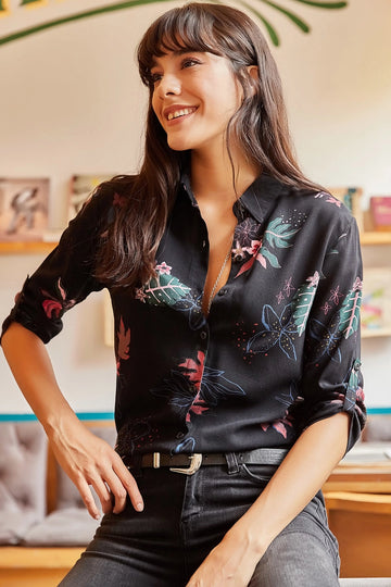 Black Patterned Garnished Poplin Loose Shirt BCBSK-25700-3074 - Cava de’ Tirreni