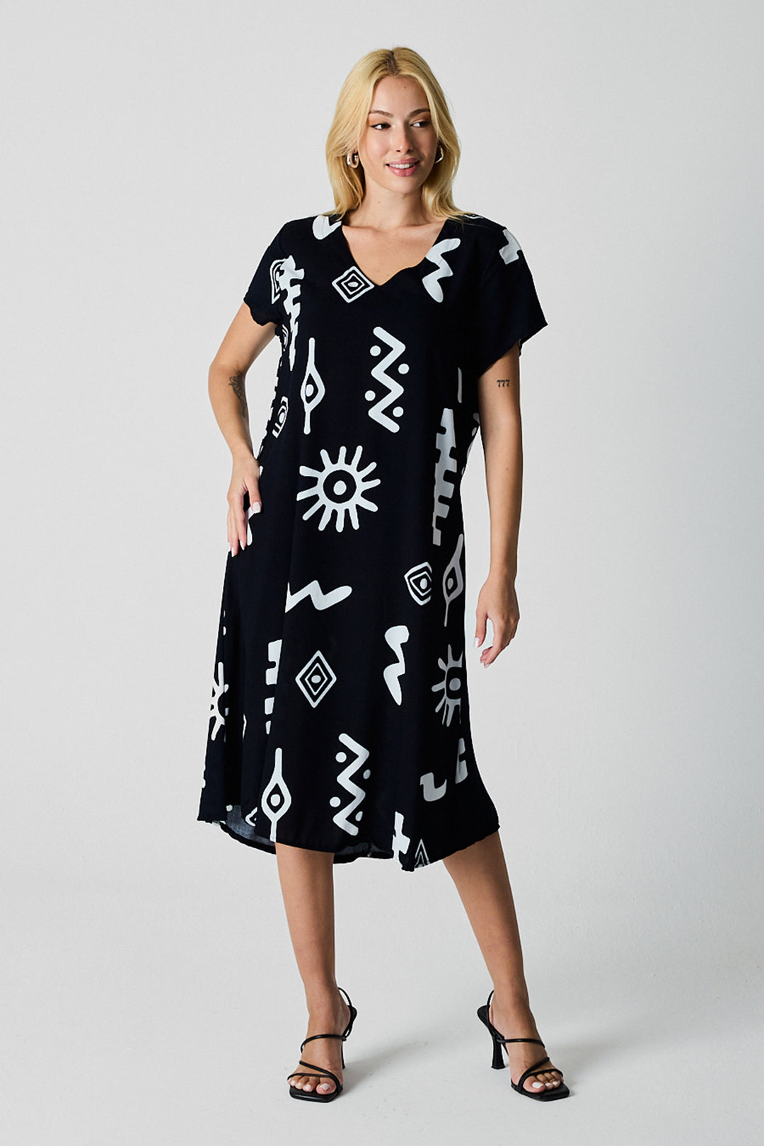 Black Patterned V-Neck Short Sleeve Slit Midi Dress BCVL-254013 - Henrietta