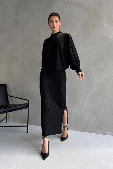 Black Pleated Slit Detailed Skirt and Blouse 2 Piece Set BCDF-242121 - Derry