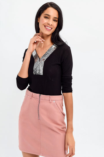 Black Sequined V-Neck Blouse BCBSK-25700-T4008280 - Zacatepec