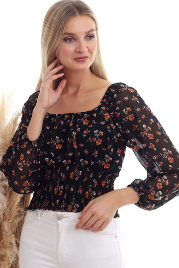 Black Tile Chiffon Patterned Waist Gathered Long Sleeve Blouse CO-2520333364 - Winston-Salem