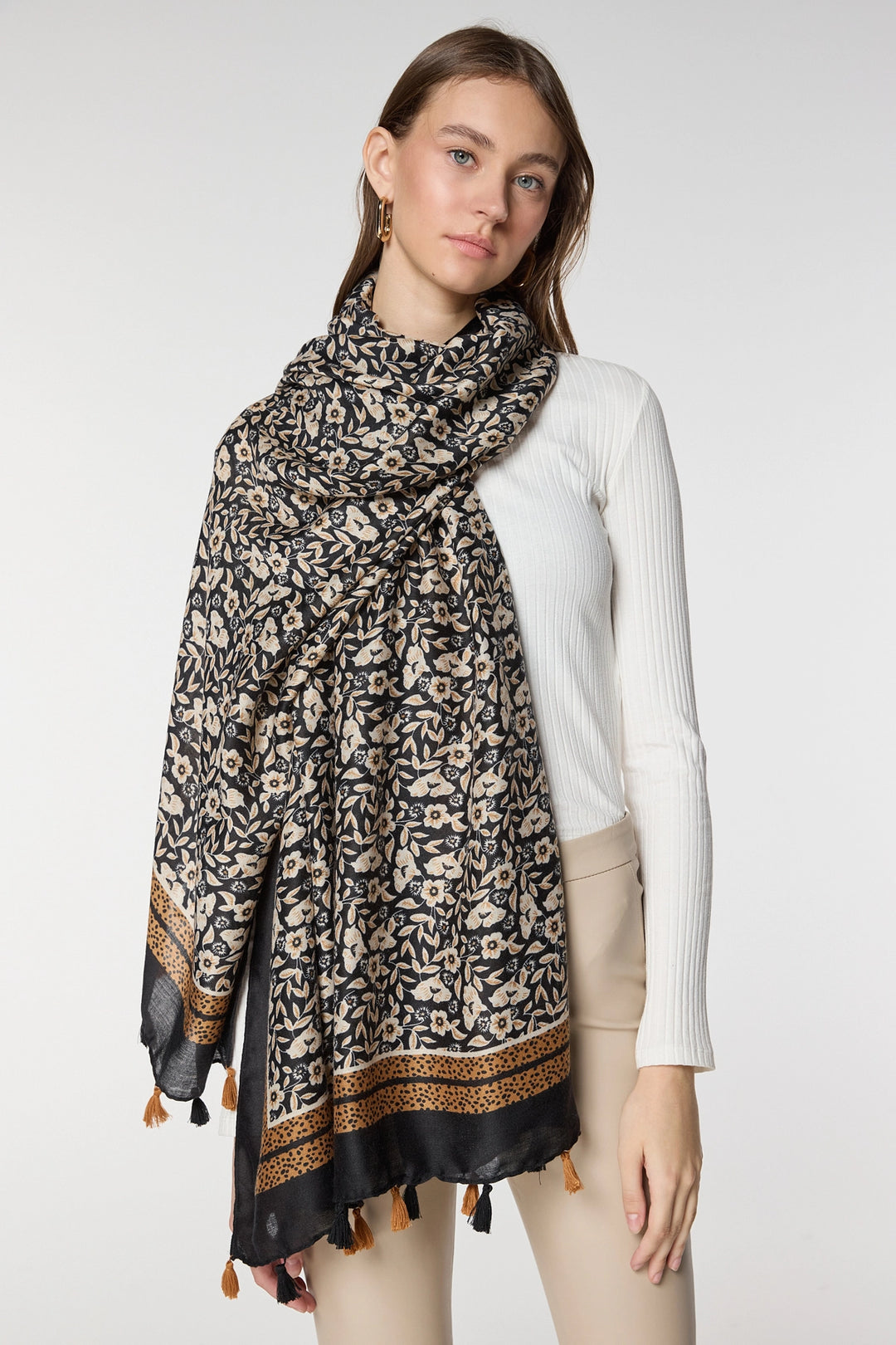 Black Tasseled Leaf Patterned Shawl BCNSV-2515060 - Potenza