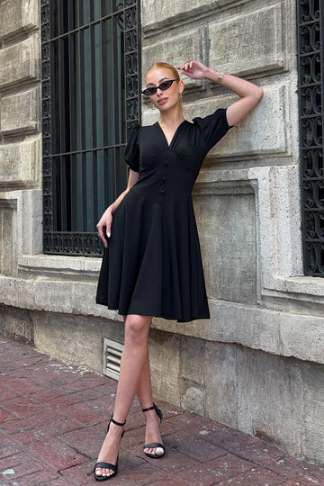 Black V Neck Collar Elastic Button Detailed Midi Flare Dress BCDF-252194 - Ascoli Piceno