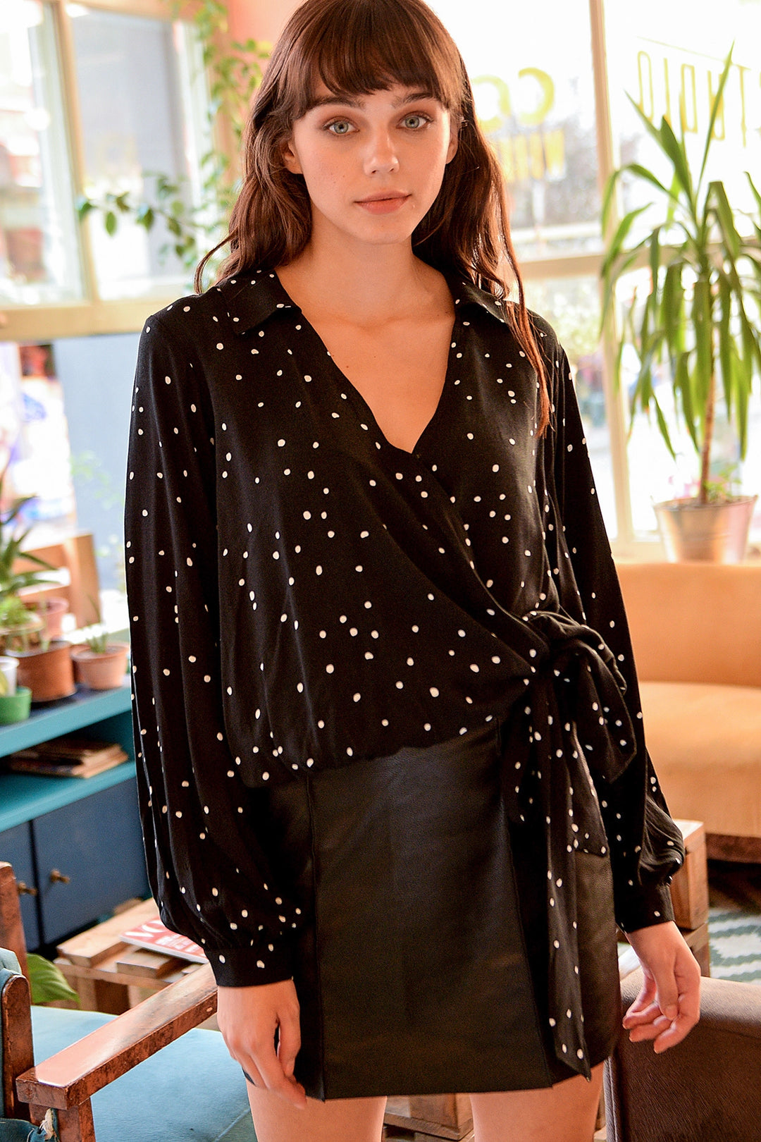 Black Wrap Neck Tied Long Sleeve Blouse BCBSK-25700-K4490 - Chula Vista
