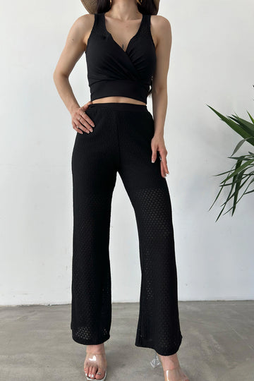 Black Wrap Neck Crop Blouse and Detailed Pants Knit Two-Piece Set BCDF-241081 - Mackay