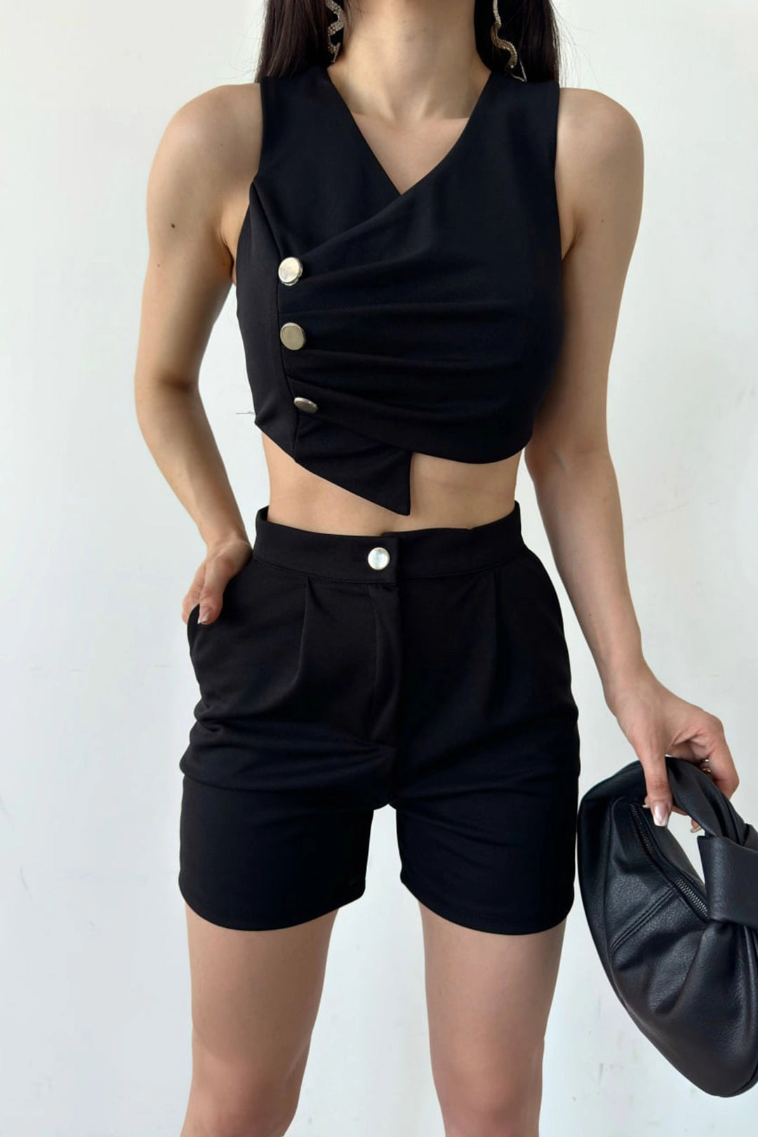 Black Wrap Neck Button Detailed Crop Vest and Shorts Set BCDF-241076 - Vaciamadrid