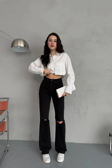 Black Wide Cuffed Double Breasted Poplin Shirt with Front Tie Closure BCDF-2530000 - Sun Prairie
