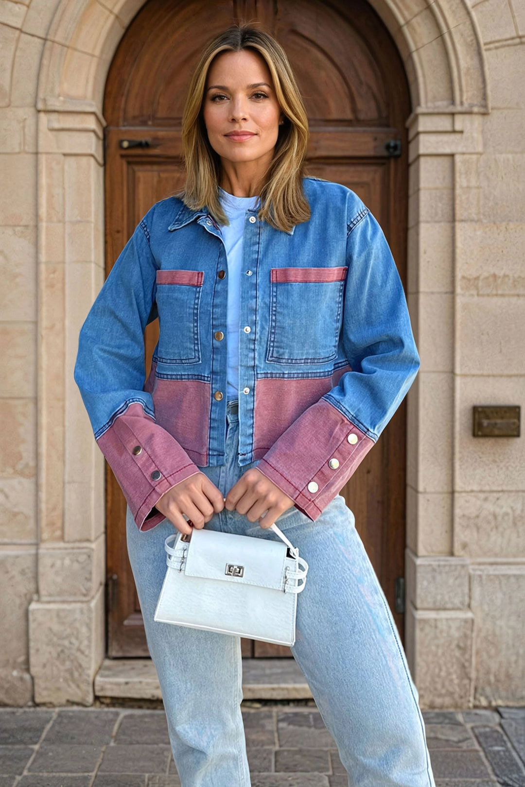 Blue Red Garnished Double Pocket Metal Snap Fastener Denim Jacket BCBSK-25700-KT0072 - Kavála