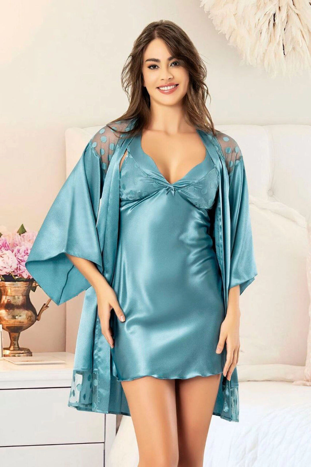 Blue Satin Lace Detailed Nightgown Set of 3 Pajamas BCAN-254909FA - Drobeta-Turnu Severin