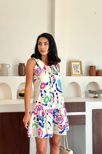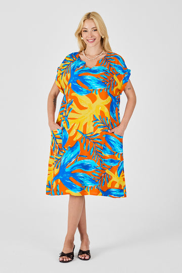 Blue-Yellow Tropical Pattern V-Neck Loose Fit Dress BCVL-254020 - Walkden