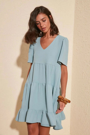 Blue V-Neck Tiered Ruffle Short Sleeve Dress BCBSK-25700-K5137 - San Benedetto del Tronto