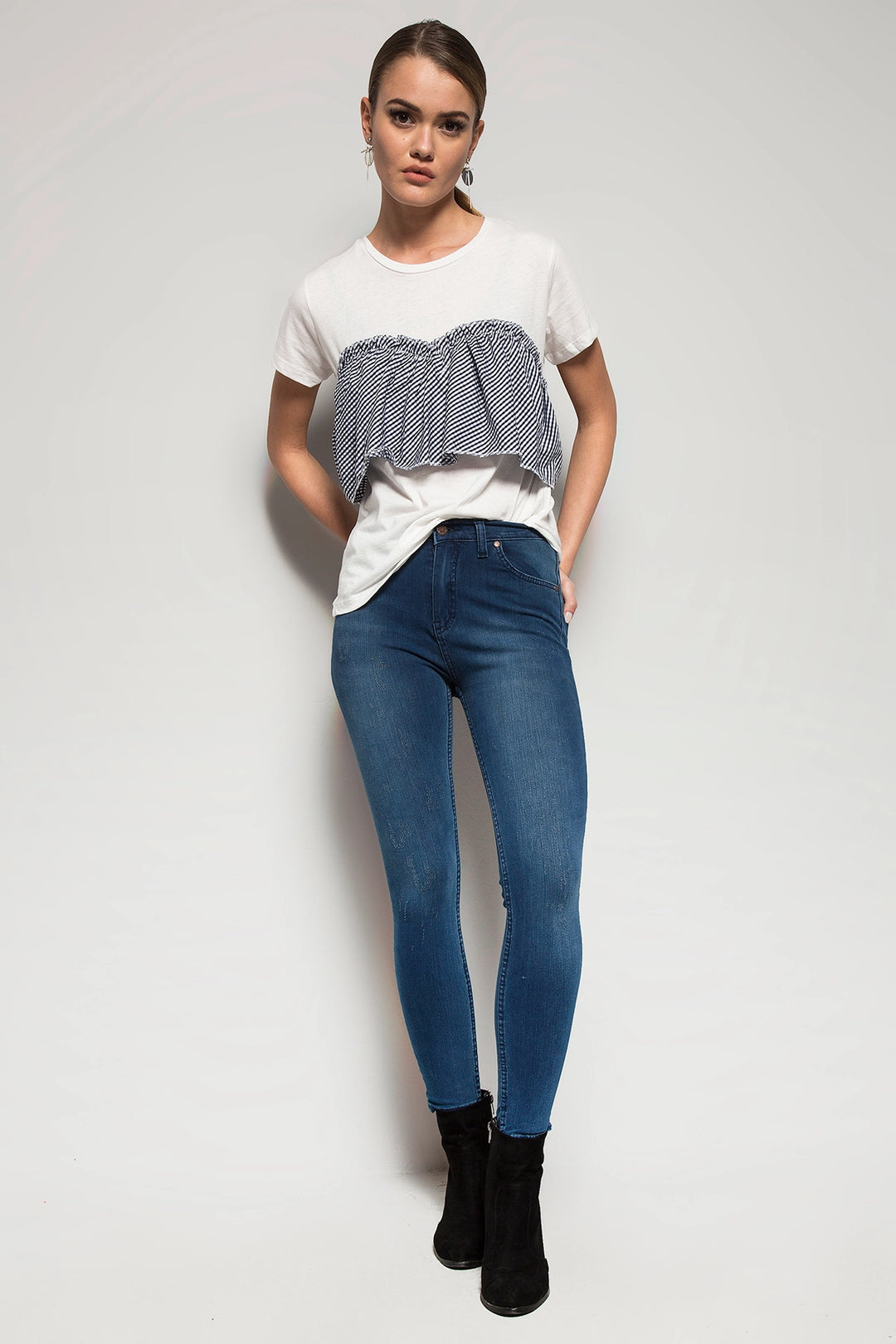Blue-White Headline and Pockets Striped Oversize Crop Woven Shirt with Garnish BC231036 - Odivelas