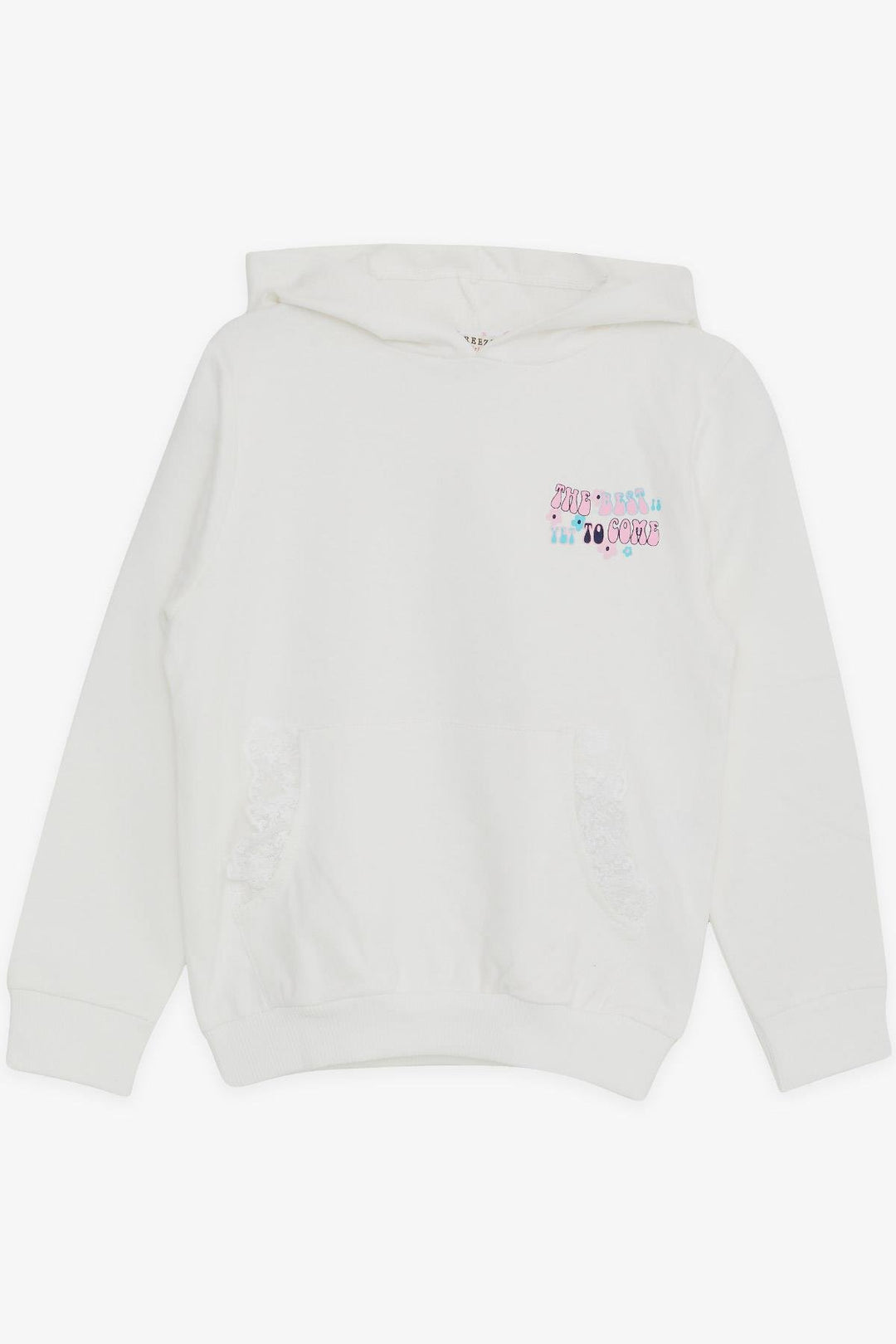 BRE Breeze Girl's Sweatshirt with Kangaroo Pocket, Printed with Text, Lace Detailed, 3-8 Years, Ecru - San Antonio
