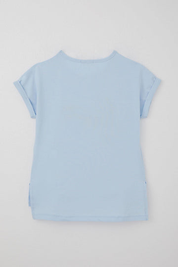 BRE Breeze Girl's T-Shirt Embossed Text Printed with Slit 106 Years, Light Blue - Berkeley