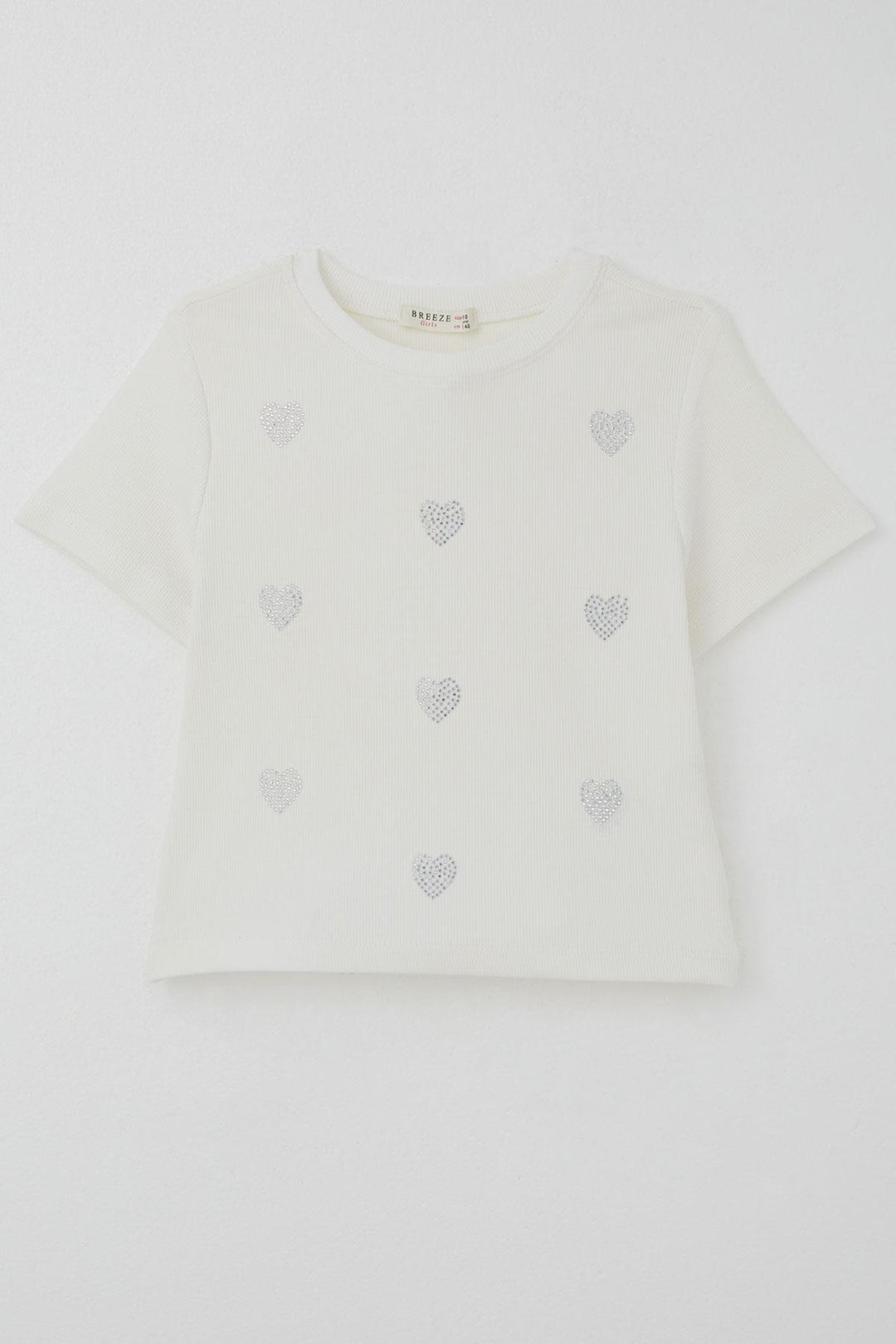 BRE Breeze Girl's T-shirt with Rhinestone Heart Pattern, 94 Years, Ecru - Zamora