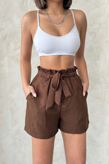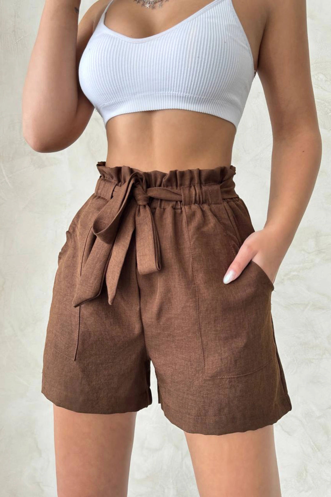 Brown Belted Linen Shorts with Detailed Elastic Waistband BCHN-2525265 - Santa Catarina Otzolotepec
