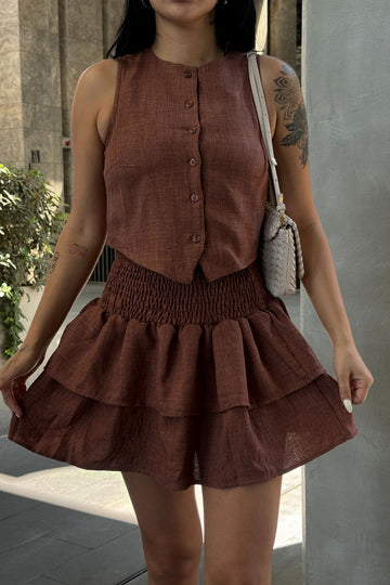 Brown Buttoned Blouse and Gipeli Mini Skirt Linen Woven Suit BCBT-251012 - Daugavpils