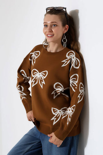 Brown Bow Patterned Knit Sweater BCES-252045 - Idaho Falls