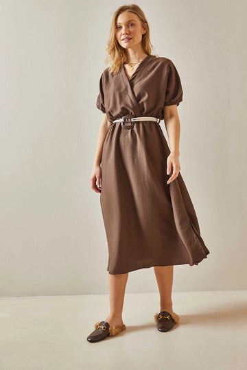 Brown Double Breasted Balloon Sleeve Straw Belted Woven Dress BC241066 - Alhambra
