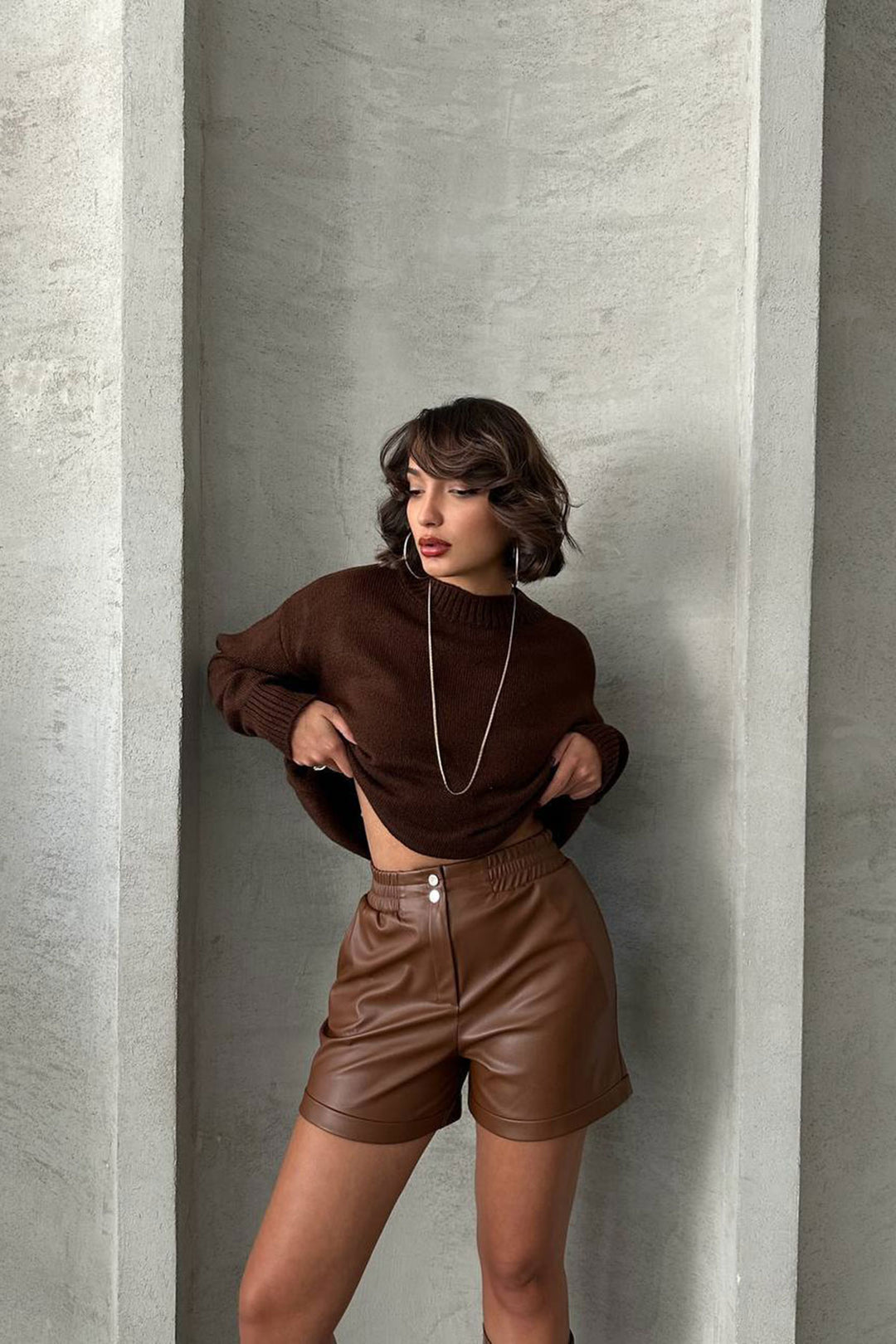Brown Faux Leather Mini Shorts with Stitching Detail BCHN-25W26312 - Newport News
