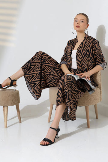 Brown Judge Collar Zigzag Patterned Shirt and Pants Woven Top Set BCVL-25V053 - Cambridge