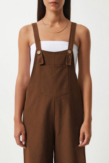 Brown Linen Blend Gardener Jumpsuit with Pocket and Ring Detail Weaving BCIR-251004 - Navapolatsk