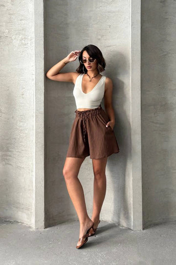Brown Double Pocket High Waist Ruffled Front Linen Shorts BCHN-2525834 - Odivelas