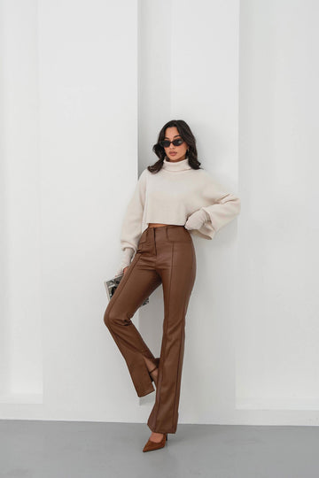Brown Front Seam Detailed Faux Leather Palazzo Pants BCHN-2526654 - Mazara del Vallo